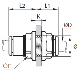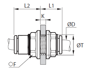 | Vöruheiti | Rörastærð D mm | Lykilmál F | Þilbreidd K mm | Lengd L1 mm | Lengd L2 mm | Utanmál T | Vörunúmer |