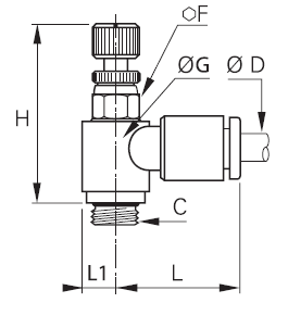| Vöruheiti | Rörastærð D mm | Gengjur C BSP/M | Hæð E mm | Lykilmál F | Hæð H mm | Mesta hæð H mm | Breidd L mm | Breidd L1 mm | Vörunúmer |